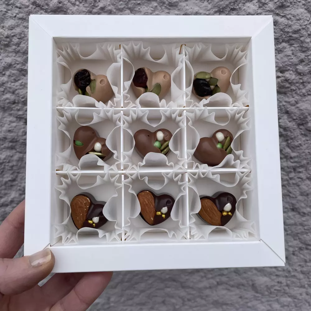 Coffret de cœurs comprenant 9 cœurs en chocolat, parfait comme cadeau pour un homme ou une femme.