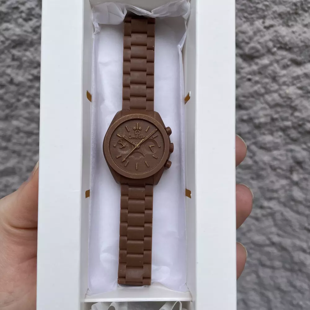 Coffret pour homme contenant une montre en chocolat finement détaillée et deux petits chocolats gourmands, parfait pour un anniversaire, la fête des pères ou toute autre occasion.