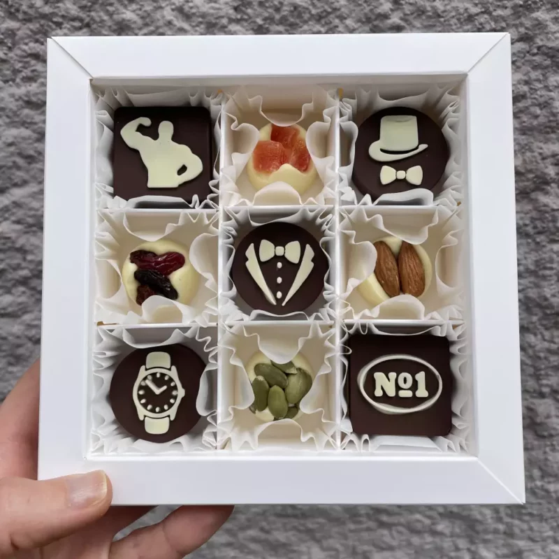 Un coffret pour homme compose de 9 petites chocolats – un cadeau original pour feliciter un papa, un mari ou un proche.